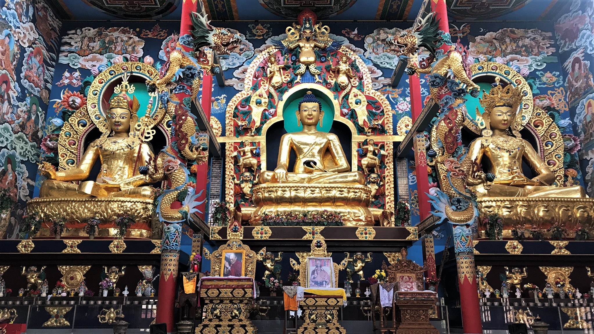 Built in the Nyingma tradition, the monastery’s main temple is home to three 60 ft tall, gold-plated statues of Buddha Shakyamuni, Guru Padmasambhava, and Buddha Amitayus. These are adorned with scriptures, relics, small statues, and clay stupas, making for an impressive sight.