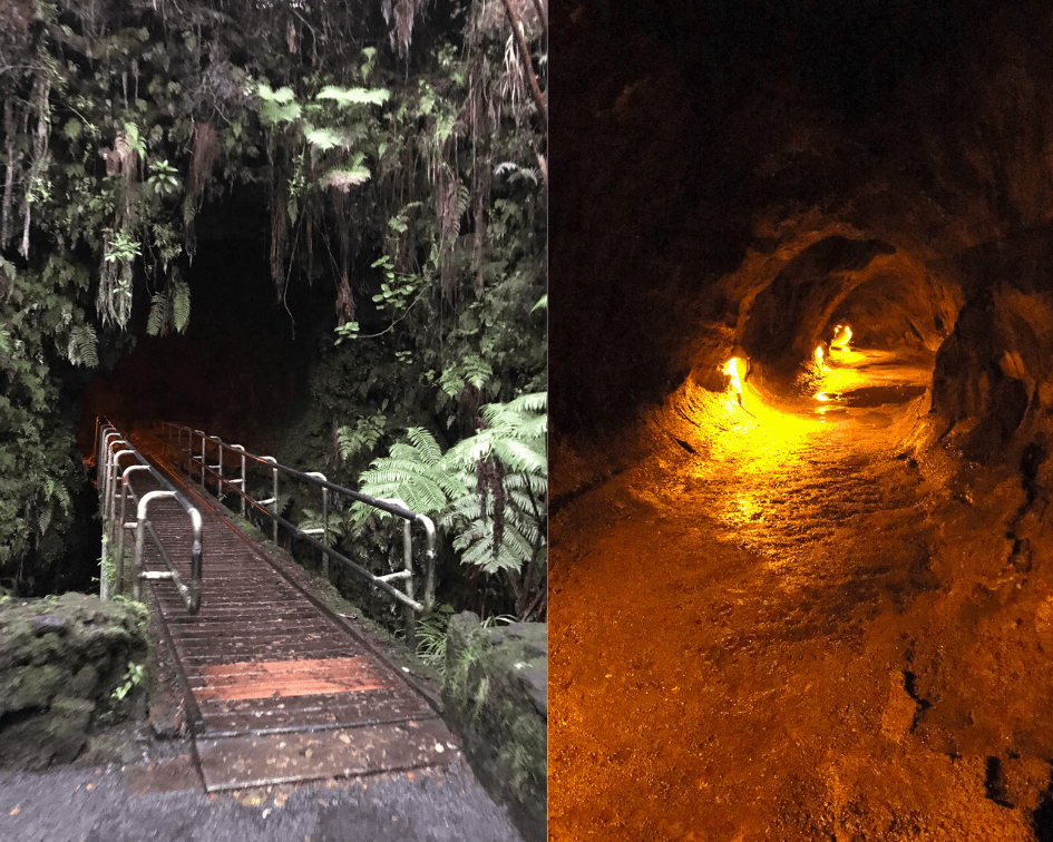 We were excited to see the crater but at 4.30 pm, in daylight, all one can see is a big hole in the ground. Some very helpful, and friendly park rangers suggested we come back after sunset for a better view so we went to see another amazing feature at the park, the lava tubes. A lava tube is formed when slow-moving lava cools over many years after an eruption and the top layer hardens into a crust, forming a tube for the molten lava to flow directly into the sea. After a short hike through a jungle that looked straight out of Jurassic Park, we were wandering around in awe and with an inexplicable frisson of fear. Inexplicable, because this tube had been absolutely empty for decades. But its a rare and amazing natural phenomenon and we reluctantly left as it got dark and drove back to the caldera.